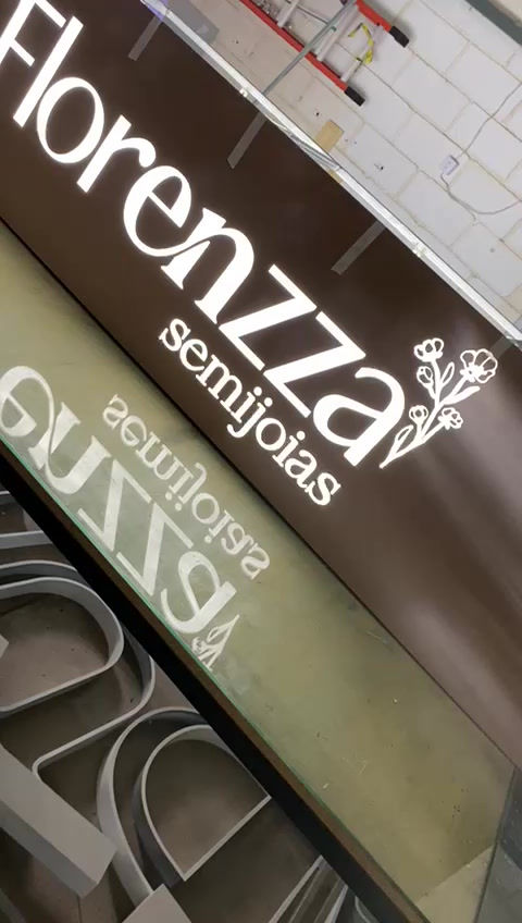 Fachada Caixote de ACM personalizado, ACM vazado com acrílico para iluminação, coluna de ACM. Toda a parte de ACM conta com uma estrutura de metalom para apoio e suporte.